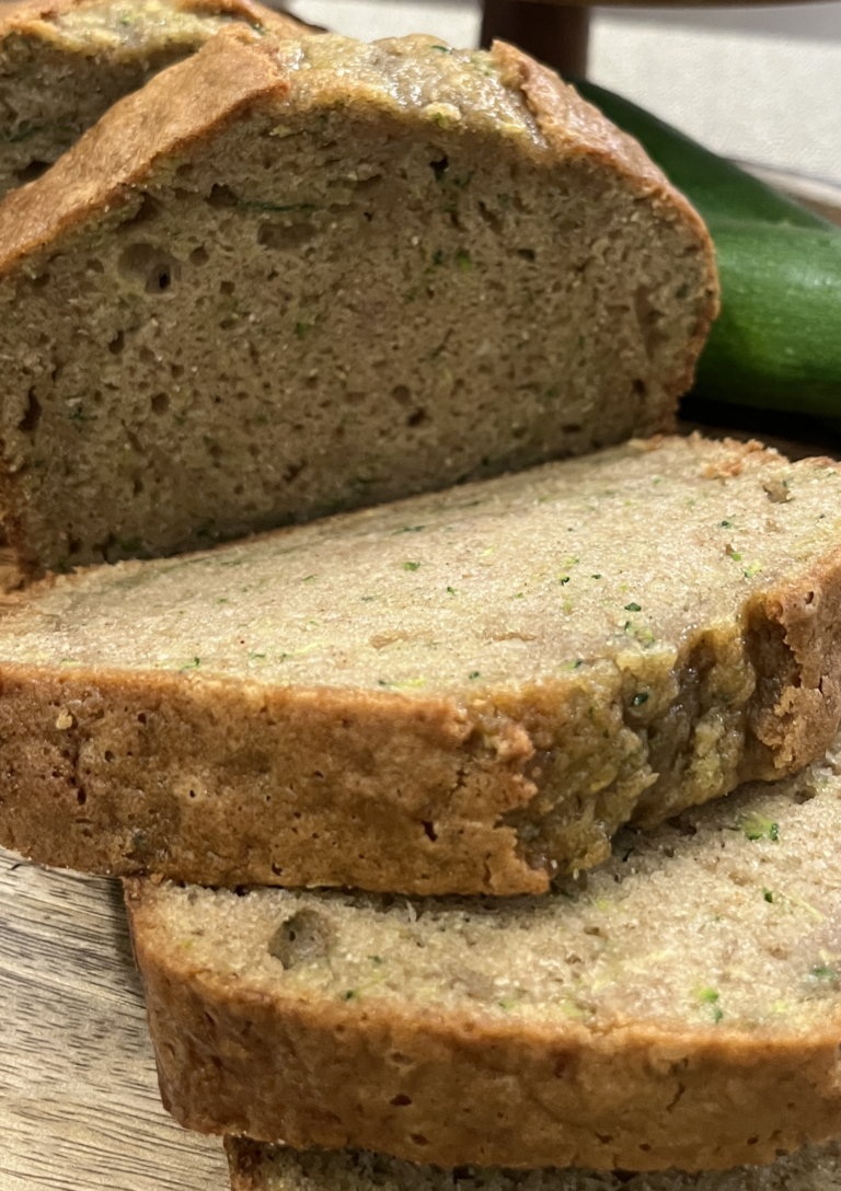 One 5″ x 10″ Zucchini Bread Loaf, sliced into ten, one inch thick pieces of zucchini bread goodness.  A sweet treat that is made with grated zucchini, cinnamon, and sugar.  A dense, yet oh so moist, and fluffy bread, that is a popular favorite.